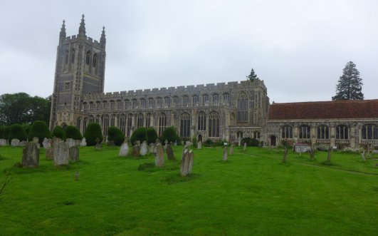 In the fifteenth and sixteenth centuries, the wool trade made Suffolk a very wealthy county, and many who had profitted from the trade became donors to their local church. Some of the these churches are among the very finest in England. In our visit to Suffolk we visited many of them, but I will focus on just three here: the church of St Peter and St Paul, Lavenham, Holy Trinity, Long Melford, and St Mary's, Bury St Edmunds. Then on to a very different church: St Andrew's Greensted, Essex, which claims to be the oldest wooden church still standing in the world. St Peter and St Paul Lavenham Although dating from Anglo-Saxon times, what you see today dates from the major reconstruction c1500. It is regarded as one of the finest late perpendicular style churches in England, if not the finest. Its tower is claimed to be the highest of any parish church in England. |
