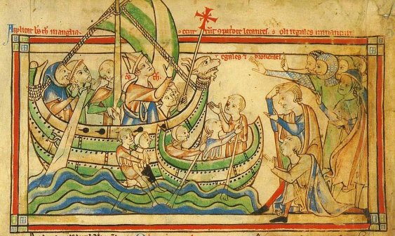 | Luttrel Psalter, early 14th century. British Library. Thomas returns to England: he is welcomed by the people, but warned off by the knights. |